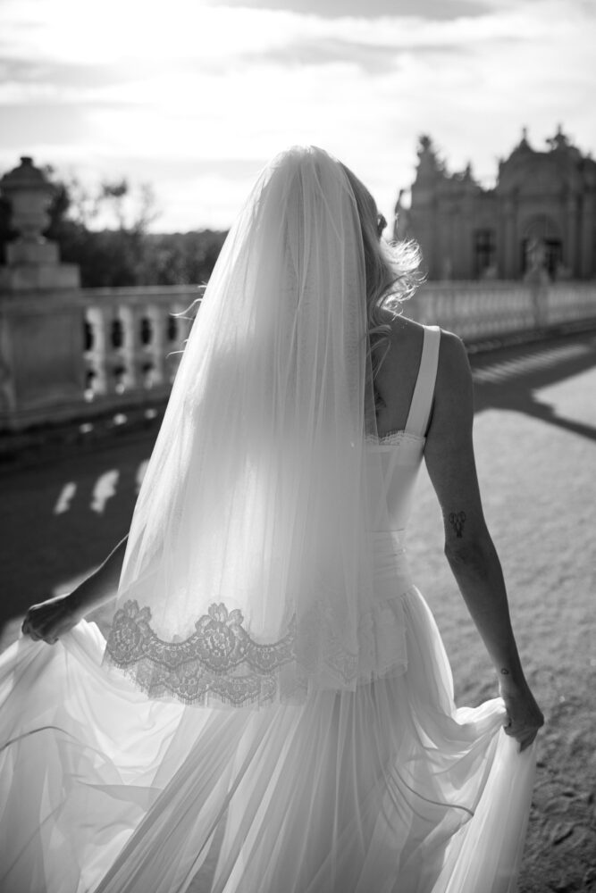 On the wedding day, she walked the gardens of Palácio Nacional de Queluz in a custom Dolce & Gabbana gown crafted through multiple visits to the Milan atelier: light, refined, and couture in its quiet elegance.