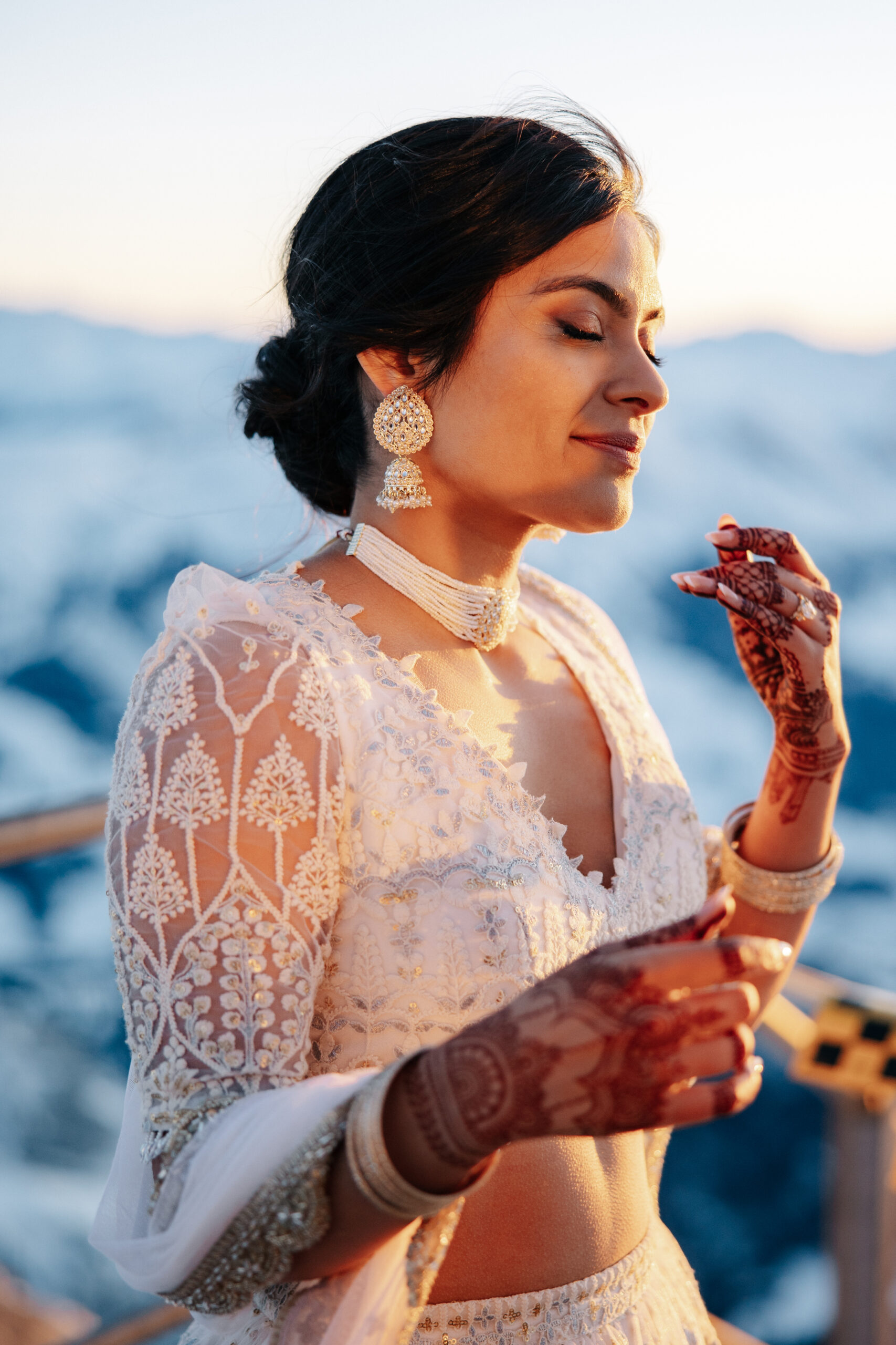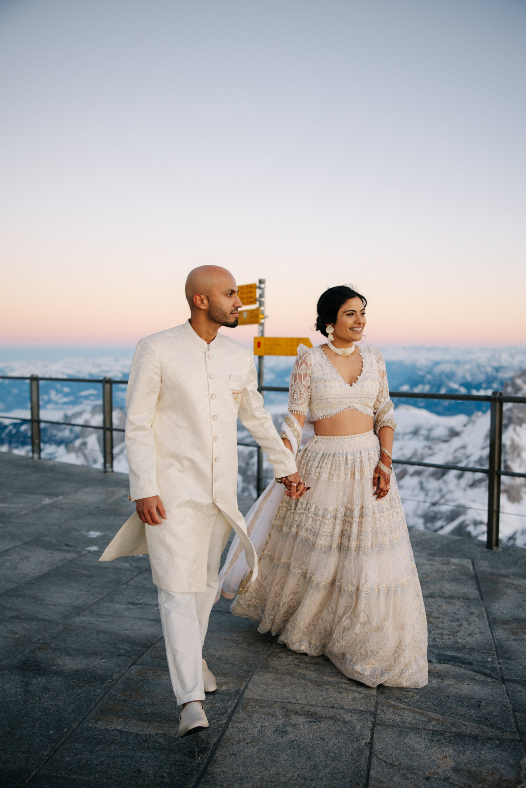 Serina & Sal celebrated a chic Swiss Alps winter wedding on December 28, 2024: a fondue welcome dinner, a gondola ascent to a mountaintop Christian ceremony enriched with Indian traditions (Manthrakodi, Thali), and a candlelit reception at Säntis – the Hotel. Modern alpine design in white and soft pink with evergreen accents set the tone for an intimate, elegant evening—heartfelt speeches, Bollywood-ready dancing, and fireside nightcaps. As seen in Condé Nast Traveler.